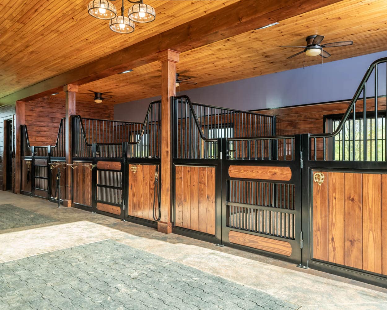 One of the standout features of this project is the extensive custom work that went into the interior. TriState Barn Builders are renowned for their interior remodeling in Waterford, and this barn is a testament to their skills. The sliding tongue and groove panels, Dutch and aluminum doors, and European-style stall fronts all contribute to the barn’s luxurious feel. The stained concrete flooring not only looks elegant but is also practical for a horse barn, providing a durable and easy-to-clean surface.